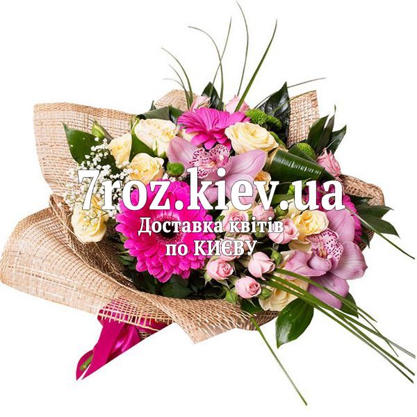 Букет із 2 орхідей, 5 троянд, 1 хризантеми і 3 гербер