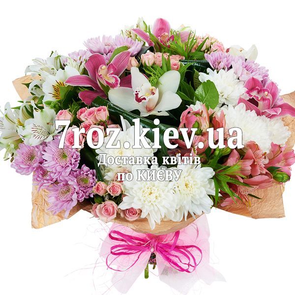 Букет із 5 орхідей, 4 кущові троянди, 5 хризантем, 3 альстромерій