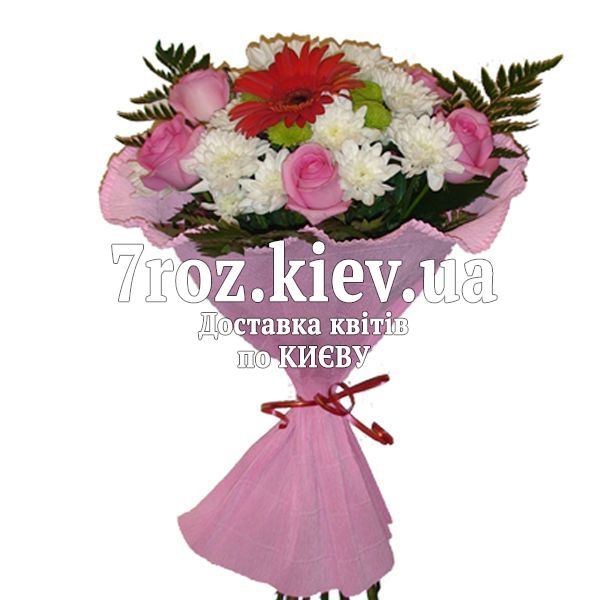 Букет із 6 троянд, 4 хризантеми і 1 гербера