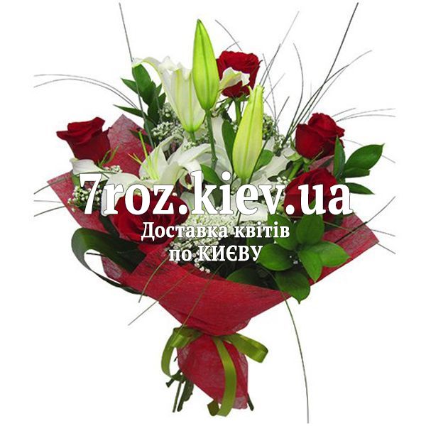 Букет квітів із 6 троянд і 1 лілії